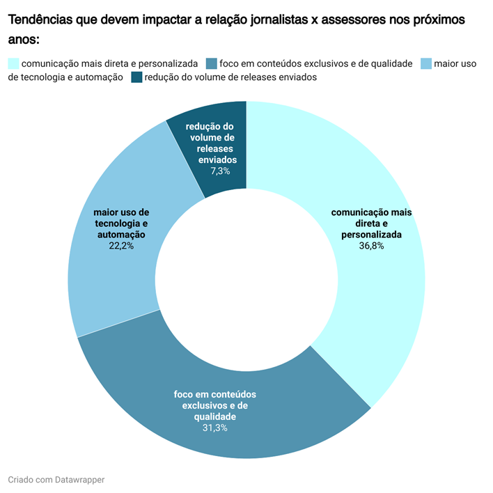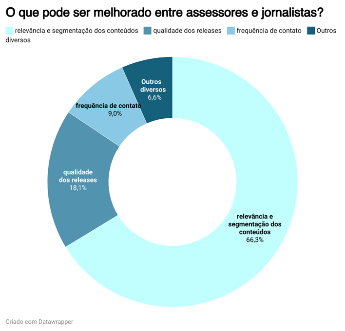 Outro ponto relevante está na expectativa de melhoria da comunicação. 66,3% dos jornalistas afirmam que a segmentação e relevância dos conteúdos enviados pelos assessores precisam evoluir. O dado reforça a busca por mensagens mais inteligentes, direcionadas e conectadas ao interesse real da redação.