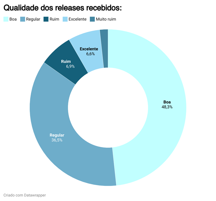 O dado fala mais alto: 48,3% avaliam os releases como bons, mas 36,5% ainda classificam como regulares. Isso mostra que o problema não é falta de esforço dos assessores, e sim falta de estratégia. Release sem relevância não gera interesse e não gera pauta.