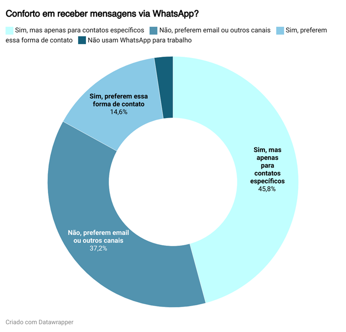 O uso do WhatsApp também segue como tema sensível. Embora 45,8% aceitem mensagens por esse canal, isso vale apenas quando já existe algum tipo de relação ou quando o contato é específico. Ou seja, o WhatsApp funciona, mas exige cuidado, contexto e propósito.
